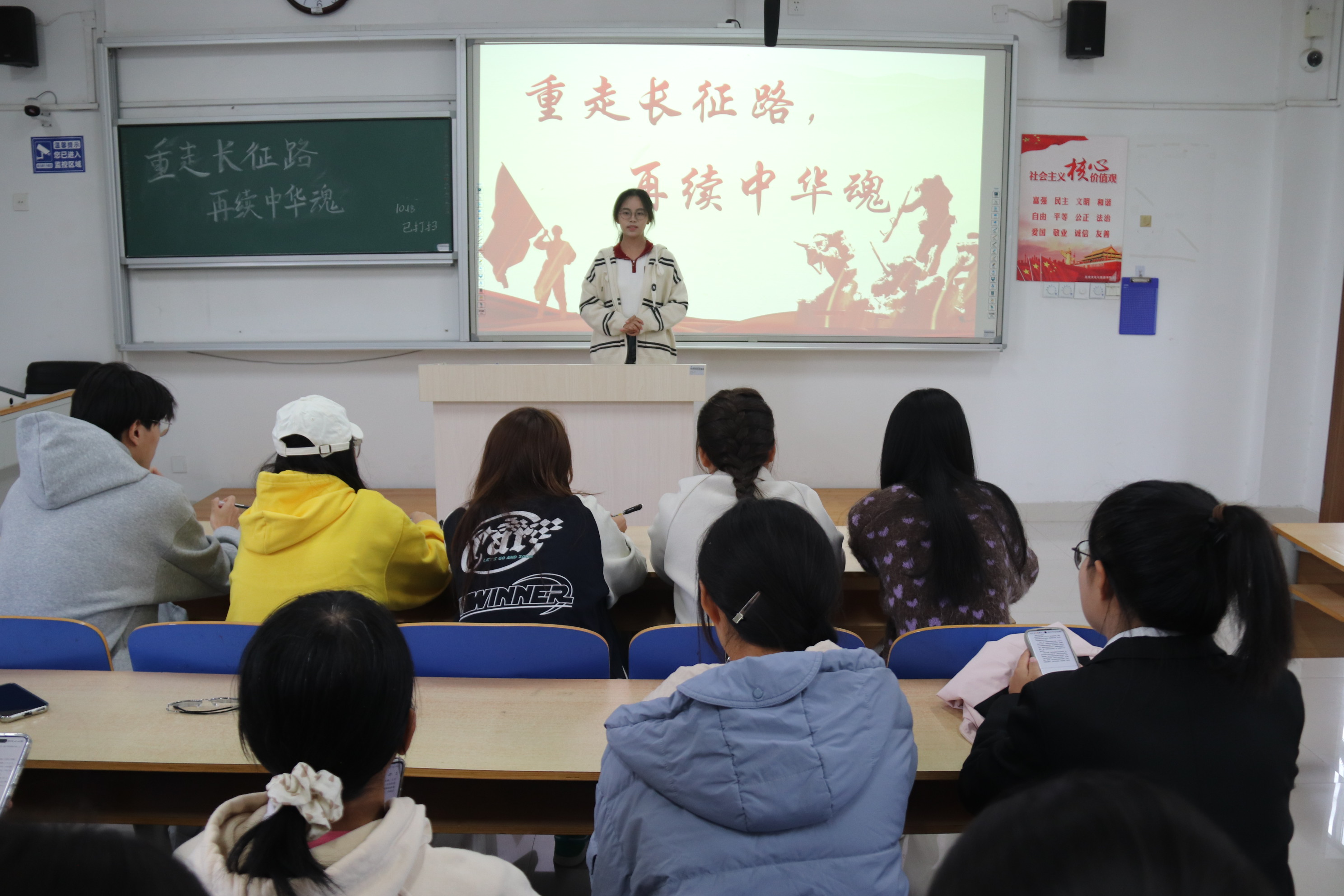 为弘扬伟大长征精神,激发同学们的爱国情怀,10月20日,我院于6#A502教室举办“重走长征路,再续中华魂”长征纪念日演讲比赛。 比赛在主持人的介绍中拉开帷幕。参赛选手们围绕长征的历史背景、英雄事迹、精神内涵等方面进行了深入研究和精心准备,用饱满的热情和真挚的情感,讲述了一个个感人至深的故事,展现了长征精神的时代价值和深远影响。 龙佳怡紧扣长征主题,以真挚的情感带领同学们重温红军长征的艰苦历程。她认为,正是老一辈革命家用鲜血和生命才换来如今祥和、安宁的社会。王健茹结合自身成长经历,阐述长征精神在新时代的传承与发扬。她号召同学们将长征精神融入血脉,以坚定的意志奋勇前行,创造出不负革命先辈期望的新成就。臧文沛借助PPT,将长征途中一个个感人至深的故事娓娓道来,并发表自己对长征精神的独到见解和深刻感悟。 比赛现场高潮迭起、掌声不断。选手们激昂澎湃、感情至深的演讲,深深感染着在场观众。经过紧张激烈的角逐,学生评委依据演讲内容、语言表达、情感表达等方面进行综合评价,最终评选出臧文沛获一等奖,田华清、侯山山获二等奖,龙佳怡、刘妍、王健茹获三等奖。 习近平总书记深刻指出:“不论我们的事业发展到哪一步,不论我们取得了多大成就,我们都要大力弘扬伟大长征精神,在新的长征路上继续奋勇前进。”本次比赛的顺利进行,有助于同学们汲取伟大精神力量,自觉传承红色基因,将长征精神内化于心、外化于行,为实现中华民族伟大复兴的中国梦添砖加瓦。 (供稿:宋佳珊 摄影:宋佳珊 初审:李月 复审:张程程 终审:尤姗姗 )