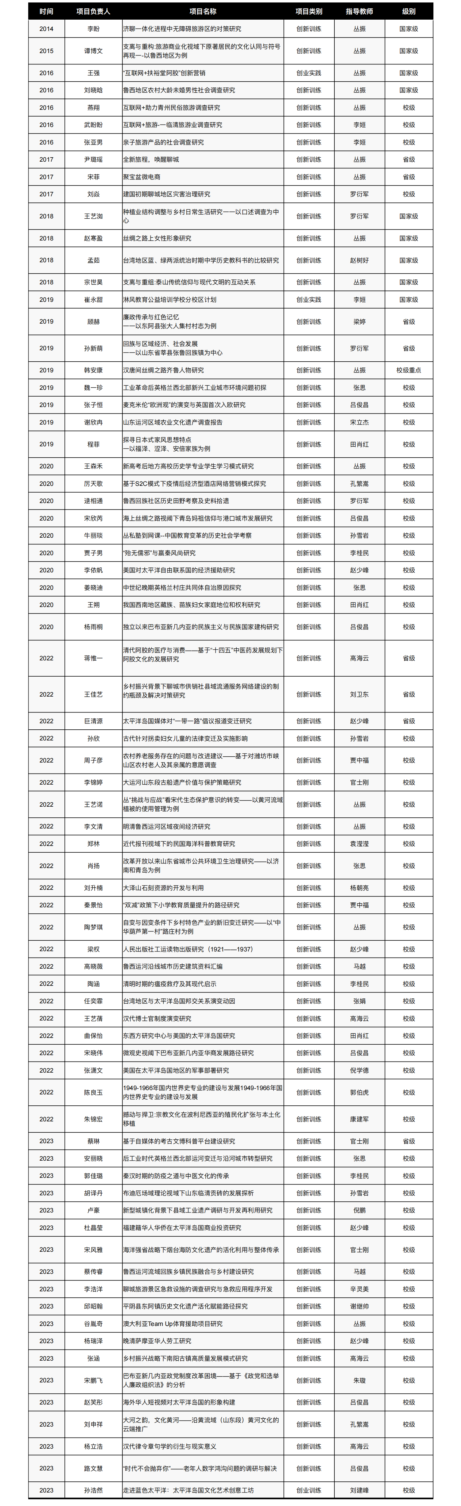 学院特别注重本科生创新创业能力的培养,许多同学充分利用学院特色高水平科研平台,积极参与教师研究课题,或者以专业视角、以“互联网+”思维解决身边社会问题。 近些年来获批的项目涉及历史学、外国语言与外国历史、旅游管理三大专业领域,具体包括旅游发展、运河社会、太平洋岛国、乡村振兴、传统文化、“一带一路”、教育培训等诸多方面,既包含创新训练,也不乏创业实践项目,既能够接地气、服务于地方社会经济发展,同时又能够胸怀天下、透过国际视野思考中国发展。 目前参与大创项目的学生与教师越来越多,获批项目数量也逐年提升,创新创业与专业学习良性互动,充分体现了新葡萄学生的专业素养、实践能力与综合素质。 新葡萄8883官网版获批创新创业项目一览表(2014-2024)