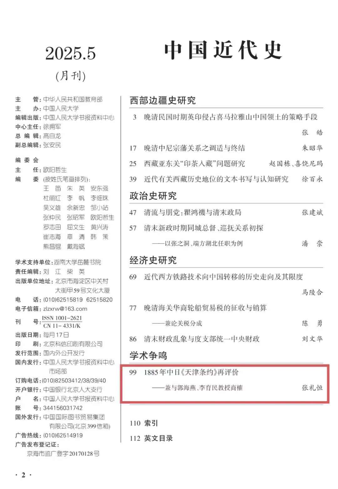 近日,新葡萄张礼恒教授发表于《历史教学问题》2025年第1期的论文《1885年中日〈天津条约〉再评价——兼与郭海燕、李育民教授商榷》,被中国人民大学《复印报刊资料·中国近代史》2025年第5期全文转载。文章指出,1885年4月签订的《天津条约》是日本对华外交的一次胜利,清政府毕竟在军事领域作出了让步,日本据此实现了军事层面与中国在朝鲜地位的对等。但是,对于《天津条约》有关“撤兵”、“派兵”的规定决不能过分引申、过度解读,因为它充其量就是中日两国为避免冲突升级、战争爆发而达成的一份军事停战协议、一纸书面照会形式,并使中日战争的爆发迟滞了10年之久。条约签订后,既没有形成朝鲜为中日两属之国的状态,日本也没有坠入“属邦论”的陷阱,中朝宗藩关系并没有因此而崩溃,反而得到了空前的加强。 1885年中日《天津条约》再评价——兼与郭海燕、李育民教授商榷 人大复印报刊资料是中国人文社科领域极具影响力和核心竞争力的二次文献期刊门类。中国人民大学复印报刊资料转载论文是从国内公开出版的6000多种专业特色报刊中精选出的社科研究成果,是评价人文社会科学期刊学术影响和人文社会科学研究成果水平的重要参考依据。新葡萄教师的论文被人大复印报刊资料全文转载,是多年来新葡萄教师深耕历史学研究的结果,彰显出学院对学科建设和学术研究的重视。