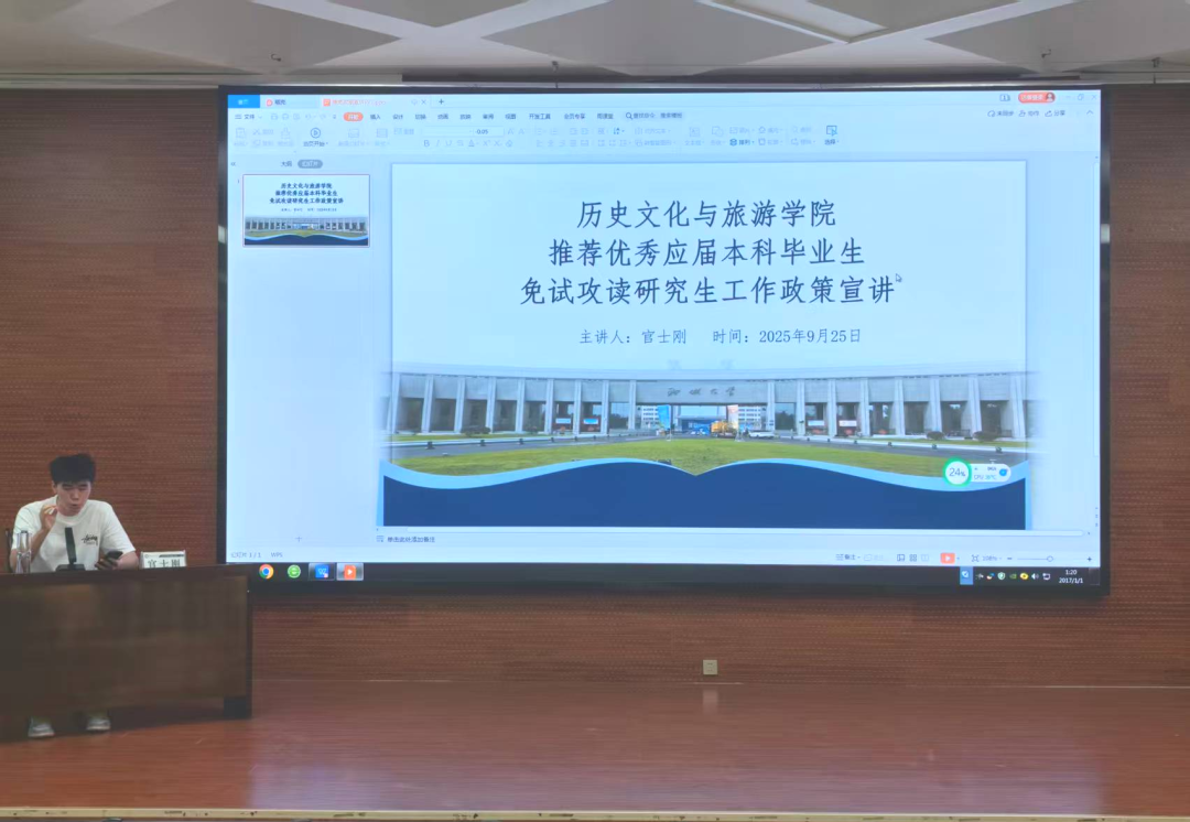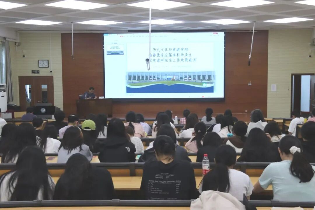 官士刚围绕学院今年推免政策的调整进行重点解读。他表示,学院将进一步优化竞赛加分机制,鼓励学生自主组建团队,以赛促学、以赛强能;并适当提高学生管理工作在评分中的比重,引导学生实现学术能力与服务实践的平衡发展。 针对升学择校,官士刚指出,学生应优先瞄准“双一流”建设高校或学科领域内的优势院校,建议学生提前关注目标院校的暑期夏令营活动,主动通过学术邮件、学术会议等渠道与意向导师建立联系,为后续保研复试积累优势。 优秀毕业生代表结合自身经历,向在场学生分享三点建议:一是尽早结合个人兴趣与专业方向,明确研究领域,有针对性地研读目标院校导师的学术专著,把握研究前沿动态;二是主动参与科研项目,丰富学术经历,提升科研素养;三是培养良好读书习惯,广泛涉猎跨学科书籍,为专业学习打下扎实基础。 本次推免政策专题宣讲会的顺利举办,不仅为学生搭建政策解读与经验交流的优质平台,帮助学生清晰把握推免流程、评分标准等关键信息,而且有效引导学生立足当下制定科学的发展规划,为后续提升人才培养质量、助力更多学生实现升学理想奠定坚实基础。 (供稿:郭艺泽 摄影:郭艺泽 初审:宋佳珊 复审:张程程 终审:尤姗姗)