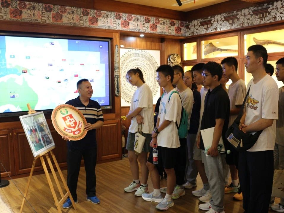 8月20日,聊城市第一实验学校高中部的102名学生(3组)走进中国—太平洋岛国应对气候变化合作中心、新葡萄官网AMG太平洋岛国研究中心(简称“中心”),在研究人员孙学美、田肖红、张剑锋老师的带领下,开展了一场富有教育意义和思想深度的参观研学活动。此次活动不仅为学生打开了认识太平洋岛国的一扇窗,拓宽了他们的国际视野,还帮助他们深入了解了二战期间中国人民与太平洋岛国人民共同抗击侵略者的历史。 孙学美博士为学生们系统介绍了中心的成立背景及其服务国家战略的重要意义。她讲解到,中国—太平洋岛国应对气候变化合作中心虽坐落于新葡萄官网AMG并由该校负责日常运行,却是由外交部、生态环境部和山东省人民政府共同建设的国家级机构。它是中国在太平洋地区推进特色大国外交的具体实践,体现了中国作为负责任大国,在应对气候变化问题上与岛国携手合作的决心与担当。新葡萄官网AMG太平洋岛国研究中心作为国内首个独立建制的太平洋岛国研究机构,凭借扎实的学术研究与精准的资政服务,为国家处理与岛国关系、推动构建中国—太平洋岛国命运共同体提供了重要的智力支持。孙学美高屋建瓴的讲解,激发了学生们的民族自豪感和以学术报国的志向。 在主题文化展厅,田肖红博士带领学生们进行了一场沉浸式的太平洋岛国历史文化之旅。从斐济纳瓦拉村落的“部落微缩景观”,到古老的树皮布与树皮画技艺;从富有社会意义的卡瓦酒与卡瓦仪式,到威猛的传统武器和精美的编织工艺品;再到体现航海智慧的带舷外支架独木舟,以及丰富多彩的邮票与钱币——每一件展品背后都蕴藏着生动的文化故事。田肖红极富感染力的讲解,让遥远国度的历史脉络、文化精髓与生活风貌变得清晰可触。同学们不仅感受到世界文明的多元绚烂,也更加理解了尊重文化差异、促进文明互鉴的深刻意义,国际视野在直观体验中得到了显著提升。 张剑锋老师结合自己在萨摩亚、汤加的从教经历,为学生们带来了一场深情而真挚的分享。他从语言学和人类学的视角,剖析了中国与波利尼西亚文化之间可能存在的悠久联系,增强了大家对跨文化渊源的认识。更令人动容的是,张老师以质朴的语言,讲述了在异国克服困难、传播友谊、践行使命的点点滴滴,生动诠释了“奉献祖国、大爱无疆”的崇高精神。他的经历本身就是一堂深刻的爱国主义教育课,鼓励同学们树立远大理想,将个人成长融入国家发展,锻造坚定的爱国信念,未来无论身在何方,都心系祖国,为民族复兴与人类命运共同体建设贡献力量。 本次活动获得了聊城市第一实验学校师生的一致好评。大家认为,中心三位老师的讲解成功将国家战略、学术前沿、异域文化与爱国主义教育融为一体,不仅拓宽了学生知识视野,更在他们心中种下了胸怀家国、勇于担当的种子。作为连接中国与太平洋岛国的桥梁,中心所展现的使命感与责任感,深深感染了每一位学子,为他们成长为具备国际视野与深厚家国情怀的新时代青年注入了强劲动力。未来,中心将继续积极开展多样化的青少年参观访学活动,助力更多青少年拓宽视野、厚植情怀,在世界舞台上讲好中国故事。